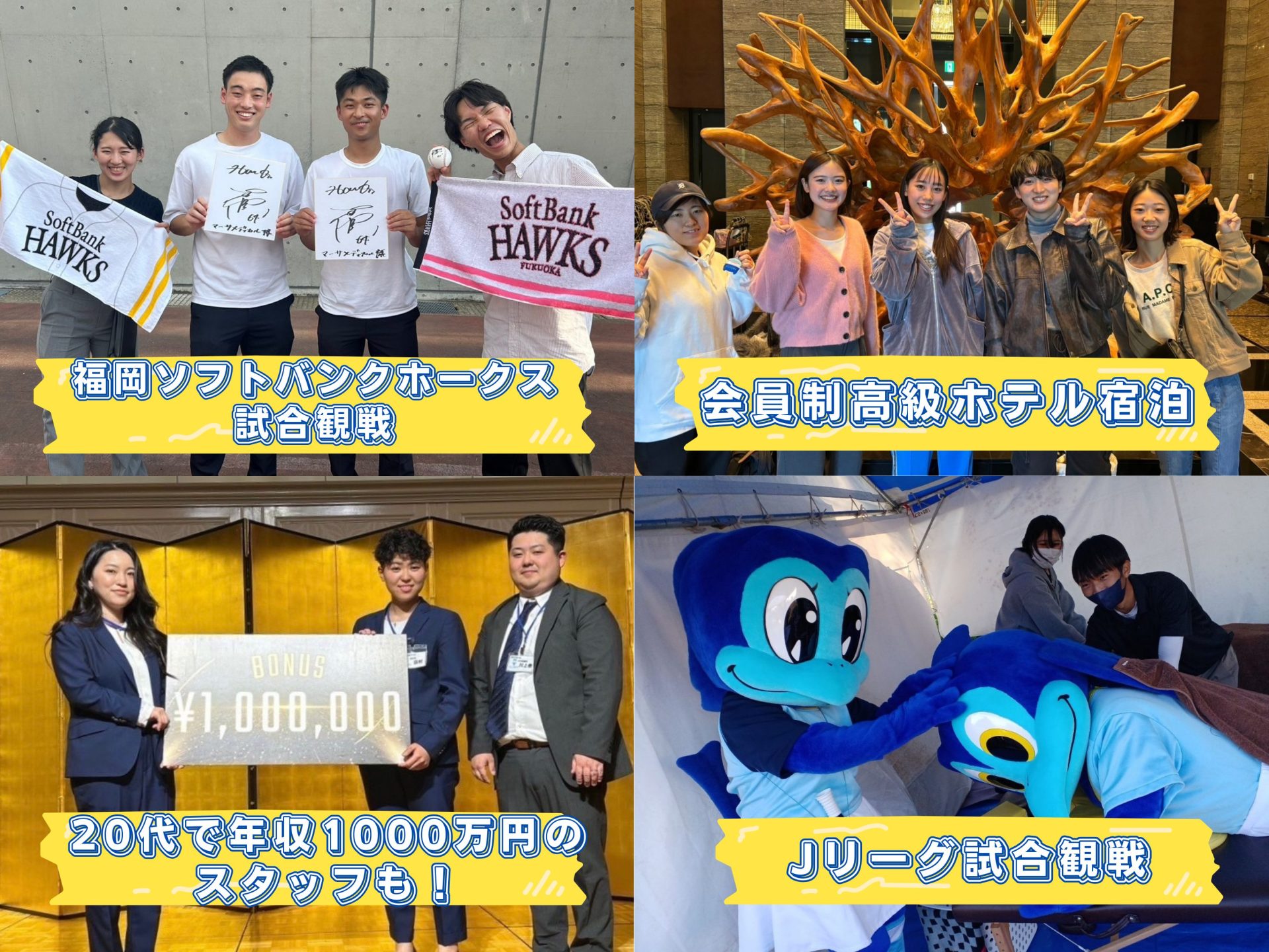 その他の福利厚生には、、、・ソフトバンク試合観戦・Jリーグ試合観戦・プロ野球の冠試合で始球式体験・会員制高級ホテルの宿泊など社内特典も盛りだくさん!