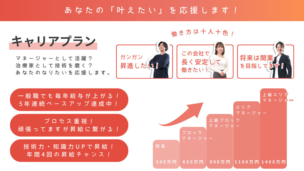治療技術だけでなく給与のアップや資格支援制度など、治療家の働きやすい環境を追求し会社もパワーアップしています!