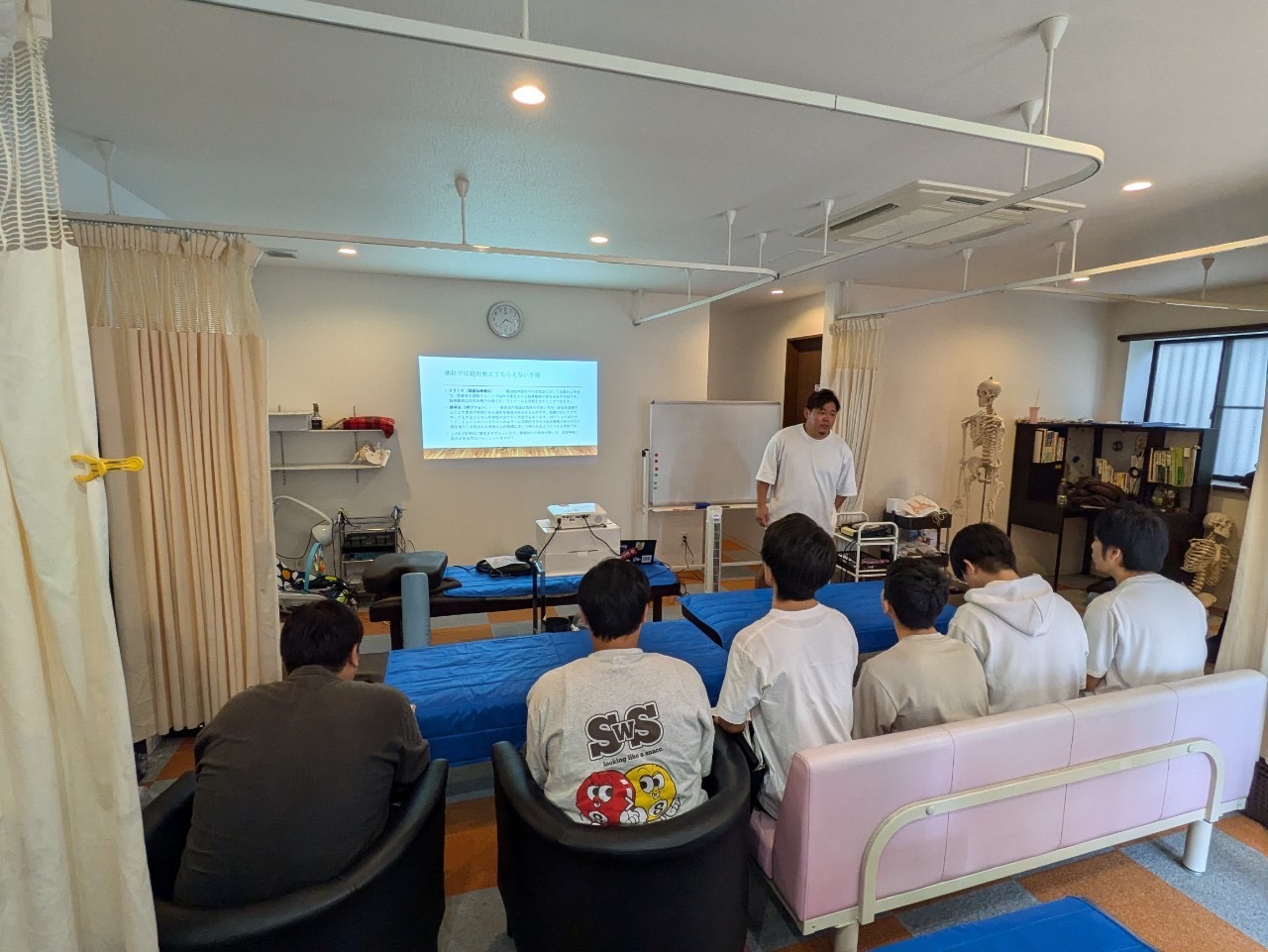 入社後2ヶ月は、様々な研修を行います。考え方の部分(社会人として、先生としてなど)施術の仕方や考え方などをお伝えします。