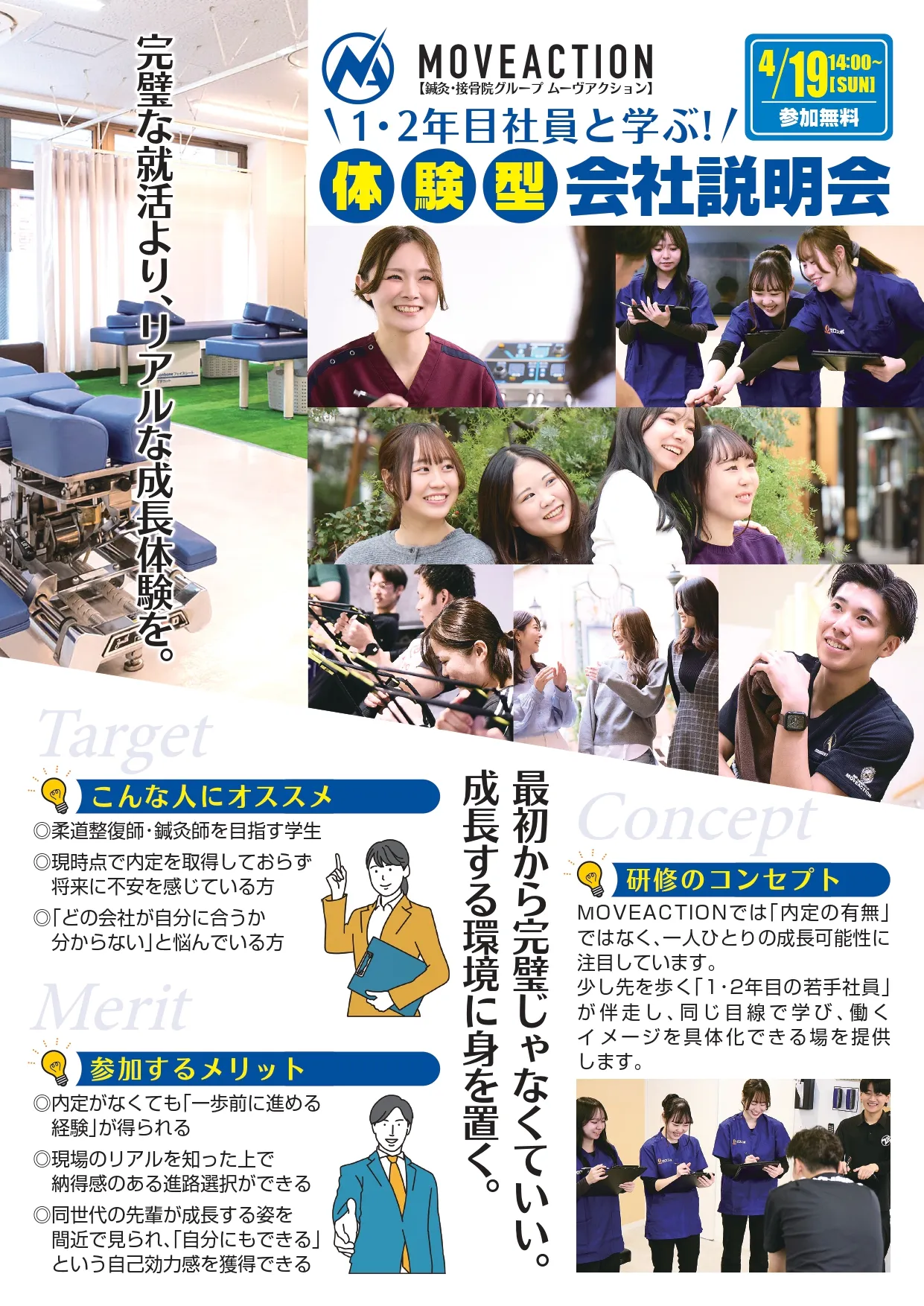 MOVEACTIONは「未病ゼロ」と「可能性の最大化」を軸に、痛みを取るだけでなく“整える→動かす→育てる”治療を追求。科学的根拠に基づくゼロ整体と、寄り添う伴走支援で、お客様が自分の身体を前向きにコントロールできる未来を創る。若手が本物の技術と人間力を磨ける成長環境があります。